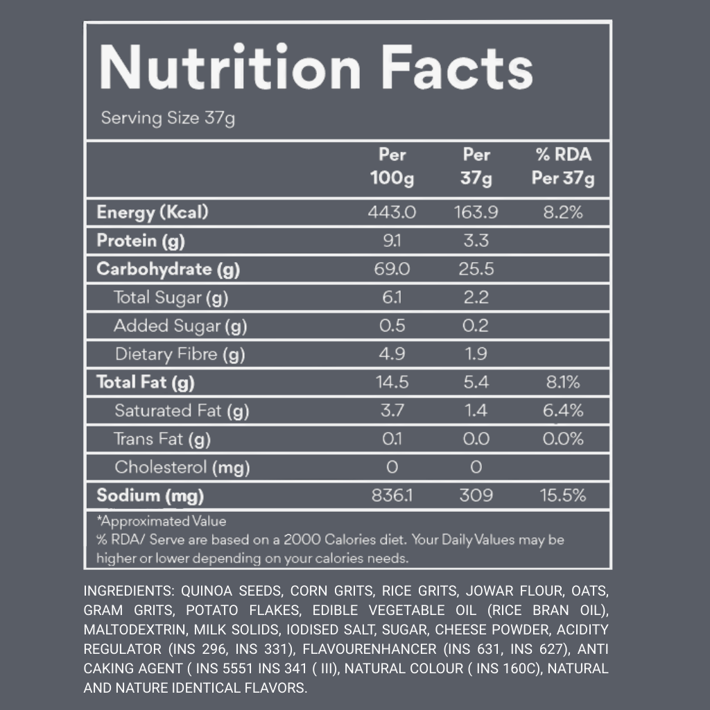 Quinoa Puffs Cheese & Tomato is crafted to bring together the rich creaminess of cheese with the tangy freshness of tomato, paired perfectly with the light, airy crunch of wholesome quinoa. Every puff is coated in a deliciously savoury seasoning that delivers a balanced, mouth-watering flavour in every bite.